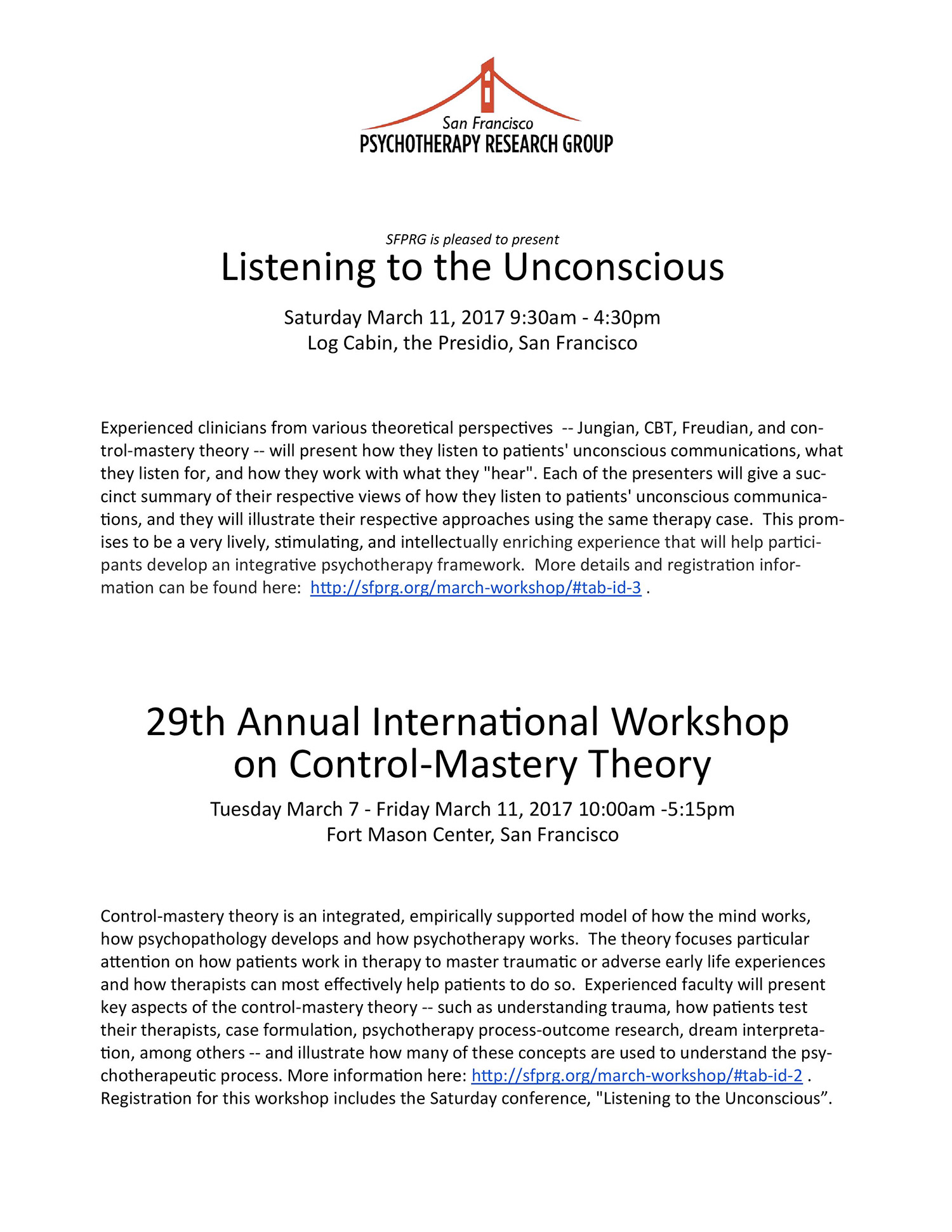 Dal 7 all’11 marzo 2017 si svolgerà a San Francisco il 29° workshop annuale sulla Control-Mastery Theory, con la partecipazione di Francesco Gazzillo, Sveva Angrisani e Roberta Alesiani.